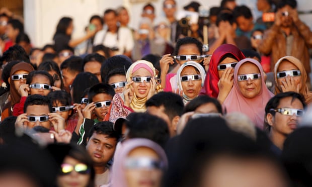 Crowds started to form at the observatory in central Jakarta as early as 3am with eclipse watchers arriving early to receive a free pair of glasses and secure the best spot.